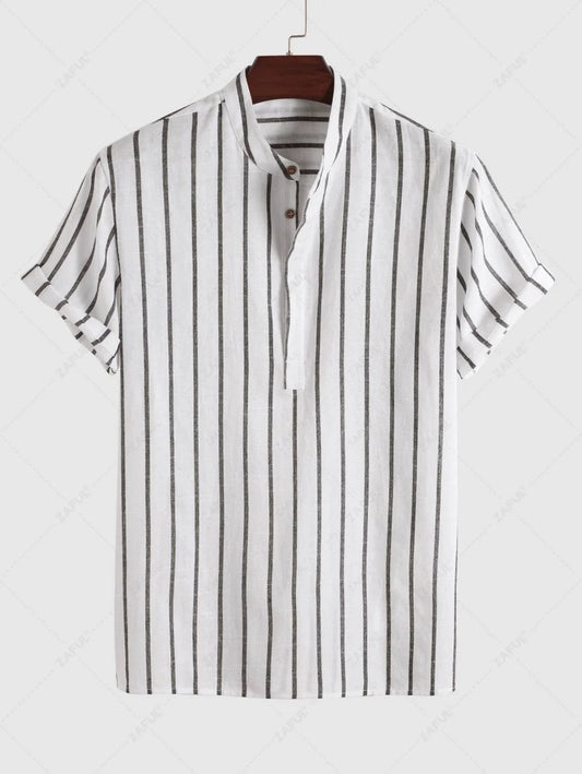 Men\'s Half Buttoned Casual Vertical Striped Office Pullover Shirt and Basic Casual Shorts Set BLUE WHITE