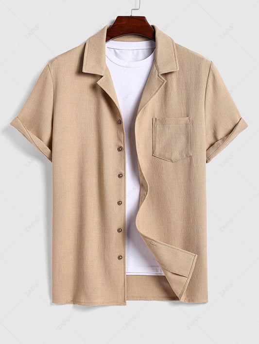 Men\'s Solid Color Textured Openwork Polo Collar Half Buttoned Short Sleeves Shirt LIGHT GREEN DEEP COFFEE