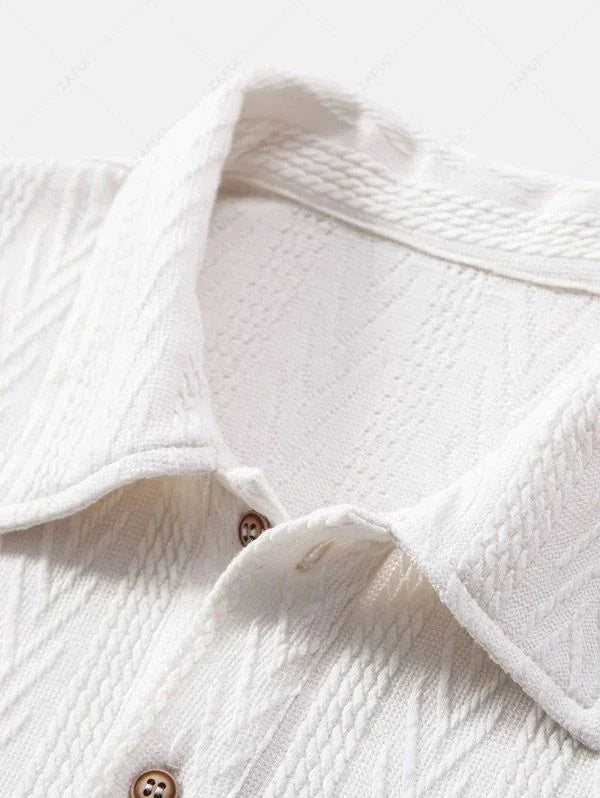 Men\'s Solid Color Jacquard Textured Polo Collar Half Buttoned Short Sleeves T-shirt and Cotton and Linen Straight Leg Pants Set BLACK COFFEE